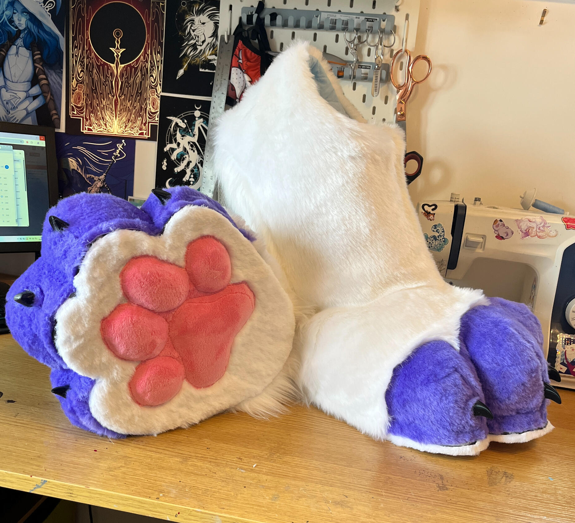 Outdoor paws start at £300Prices may increase for complex designs such as extra fur colours, complex markings and whether or not claws are wanted. I use a variety of patterns, and make feetpaws from scratch depending on the clients needs.(pictured: Digitigrade paws with interchangeable soles)